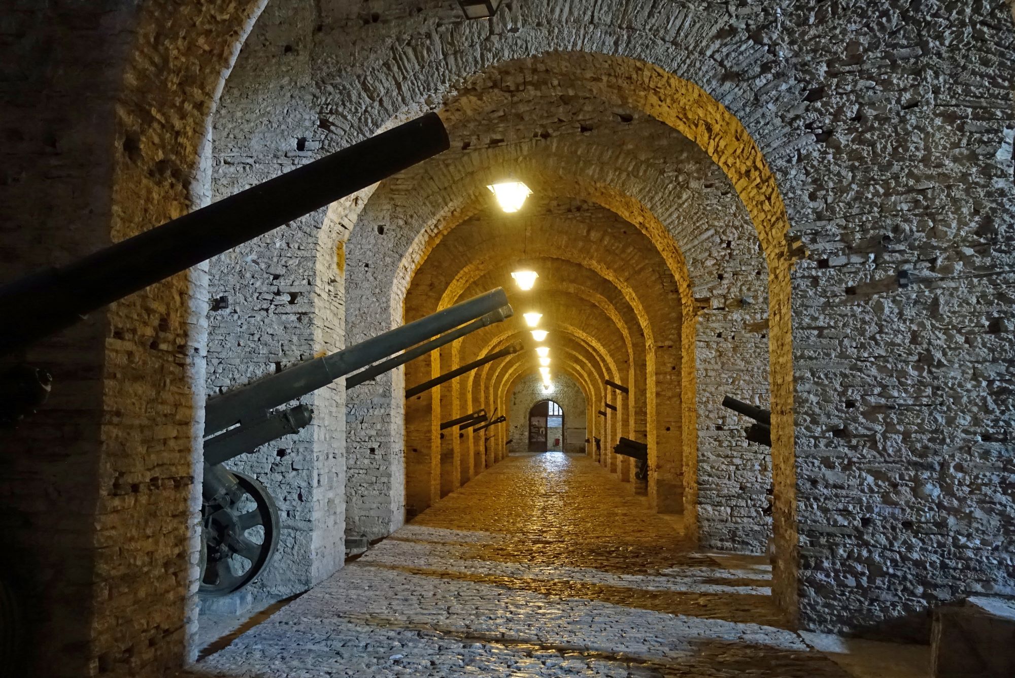 Po wejściu do twierdzy kierując się w lewo znajdziemy się w wielkiej galerii, czyli długim korytarzu. Zawiera ona część średniowiecznego zamku odkrytego w czasie prac archeologicznych. Po obydwu stronach galerii znajdują się działa, które zostały zdobyte przez partyzantów albańskich na włoskim i niemieckim okupancie. Na końcu galerii znajduje się pomnik „bohaterskiego partyzanta” autorstwa jednego z najwybitniejszy albańskim rzeźbiarzy Odise Paskaliego. Stworzył on również znajdujący się na głównym placu Gjiroskatry pomnik Çerçiza Topulliego oraz monumentalny Jerzego Kastrioty Skanderberga na koniu zlokalizowany w centrum Tirany. Monument jest typowym przykładem socrealizmu. Warto zwrócić uwagę na wyraźnie rysujące się umięśnienie partyzanta oraz przygotowanie bojowe. Dysponuje on zarówno karabinem, pistoletem jak i zapasem amunicji. Obok pomnika „bohaterskiego partyzanta” znajduje się prawdziwy rarytas militarny - lekki czołg włoski Fiat, czyli carro armato L6/40. Ważący prawie 7 ton czołg był uzbrojony w działo 20 mm firmy Breda oraz jeden karabin maszynowy. Dwuosobowy czołg był wykorzystany przez Włochów m.in. w walkach w Afryce Północnej i w Związku Radzieckim. Po ich kapitulacji we wrześniu 1943 ocalałe czołgi zostały przejęte przez Niemców. Brały one udział w działaniach przeciwko partyzantom na półwyspie Bałkańskim. Znajdujący się w twierdzy Fiat L6/40 został zdobyty przez partyzantów albańskich. W czasie wojny wyprodukowano 283 egzemplarze czołgu a do obecnych czasów przetrwały zaledwie trzy.