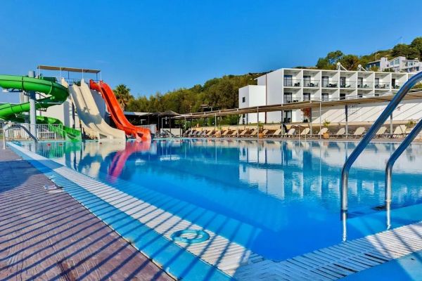 Evita Resort to dobry wybór dla rodzin z dziećmi dzięki formule All Inclusive (pełne wyżywienie i napoje w cenie), która zapewnia wygodę i brak stresu związanego z organizacją posiłków. Na terenie hotelu znajduje się basen oraz wydzielona strefa dla najmłodszych, a w pobliżu dostępne są dodatkowe atrakcje, w tym popularny park wodny. To komfortowa, sprawdzona opcja na rodzinne wakacje w słonecznej Grecji w rozsądnym budżecie.